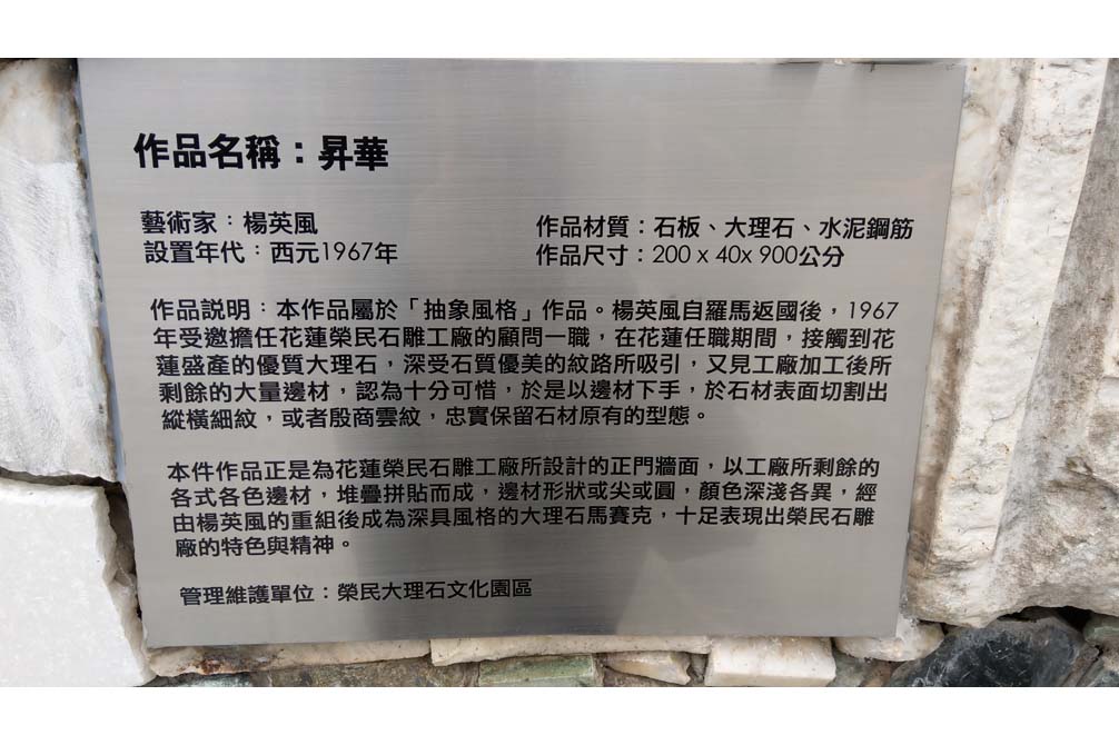 拍攝內容:1967年將[昇華(三)]設置於花蓮榮民大理石工廠,關廠後,2016年移置到臺東農場花蓮分場裡的花蓮縣榮民大理石文化園區