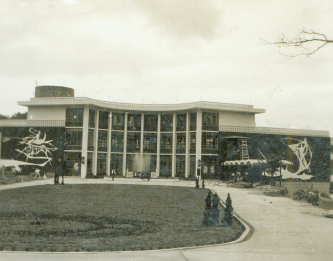 值得一提的是三面大的浮雕設計與製作。這是出諸自由中國名青年雕塑家楊英風先生之手。他把兩壁的浮雕,以日月為主題。在「日」的一面中,以體魄健旺,精神奕奕的男子象徵太陽,也象徵陽剛的大地之子,他高舉的雙手隱沒在雲端,他兩手的上方,有一個圓形的環,代表行星的軌道,其上有一顆圓球,是行星也是原子。大地之子的腳下和身旁有許多強有力的線條,暗示著他的思維,他的能力,關係宇宙,足以控馭萬有。這一面整個的線劃連接,宛如一條從大海躍起的巨鰲。
