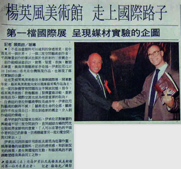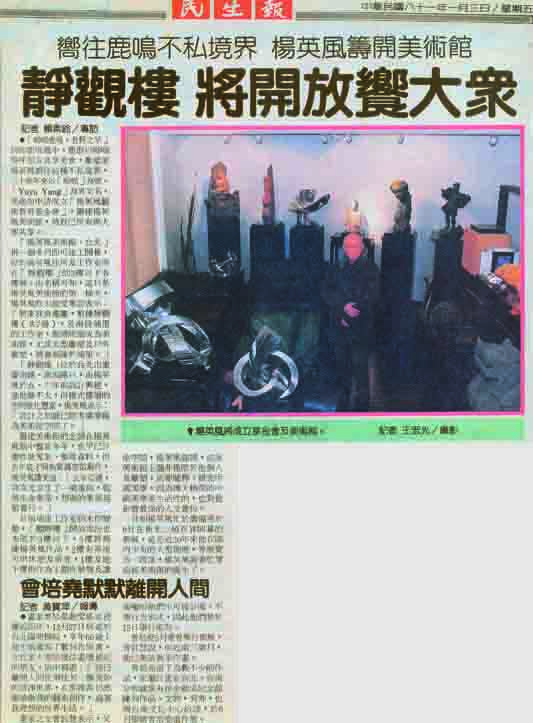 ˙〈楊英風美術館 今天披紅綵 臨近歷史博物館,「探討景觀雕塑特展」將打頭陣〉〈宏揚中國美學觀 並整理楊氏著述以供研究〉《工商時報》第20版,1992.9.26,台北︰工商時報社。